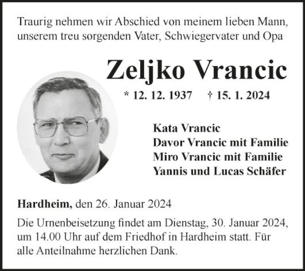 Hier finden Sie alle Traueranzeigen aus der Zeitung, die bisher für Zeljko Vrancic erschienen sind. Weitere Traueranzeigen, die in der Zeitung erscheinen, werden hier ebenfalls aufgelistet