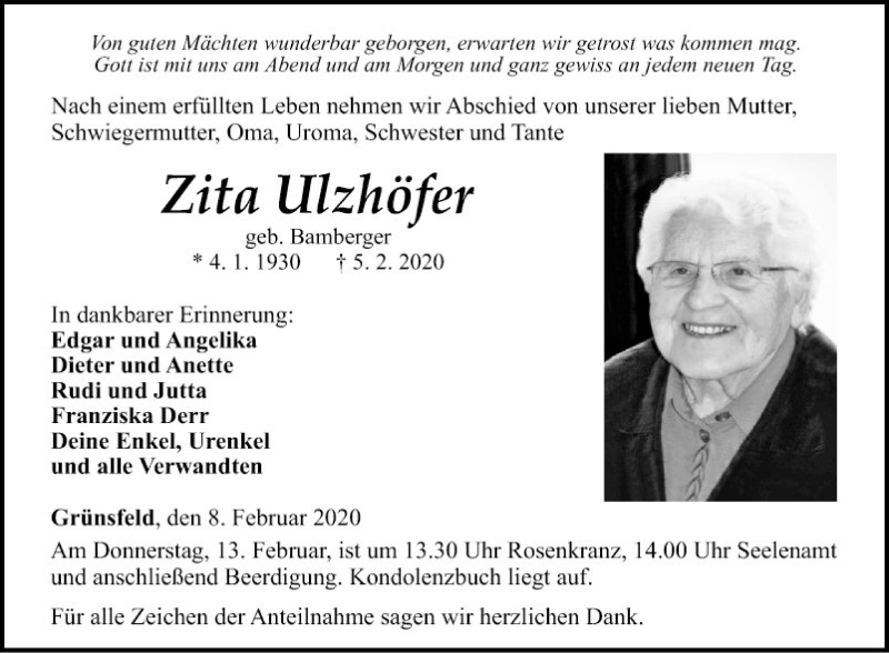 Hier finden Sie alle Traueranzeigen aus der Zeitung, die bisher für Zita Ulzhöfer erschienen sind. Weitere Traueranzeigen, die in der Zeitung erscheinen, werden hier ebenfalls aufgelistet